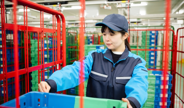 お弁当やパン、パスタ、サラダなどの冷蔵商品を扱う仕事です。倉庫内は年間を通して温度が一定に保たれているため、比較的快適に作業できます。扱う商品も片手で持てる軽いものが多く、体力面での負担が少ないため、幅広い年代のスタッフが無理なく活躍しています。